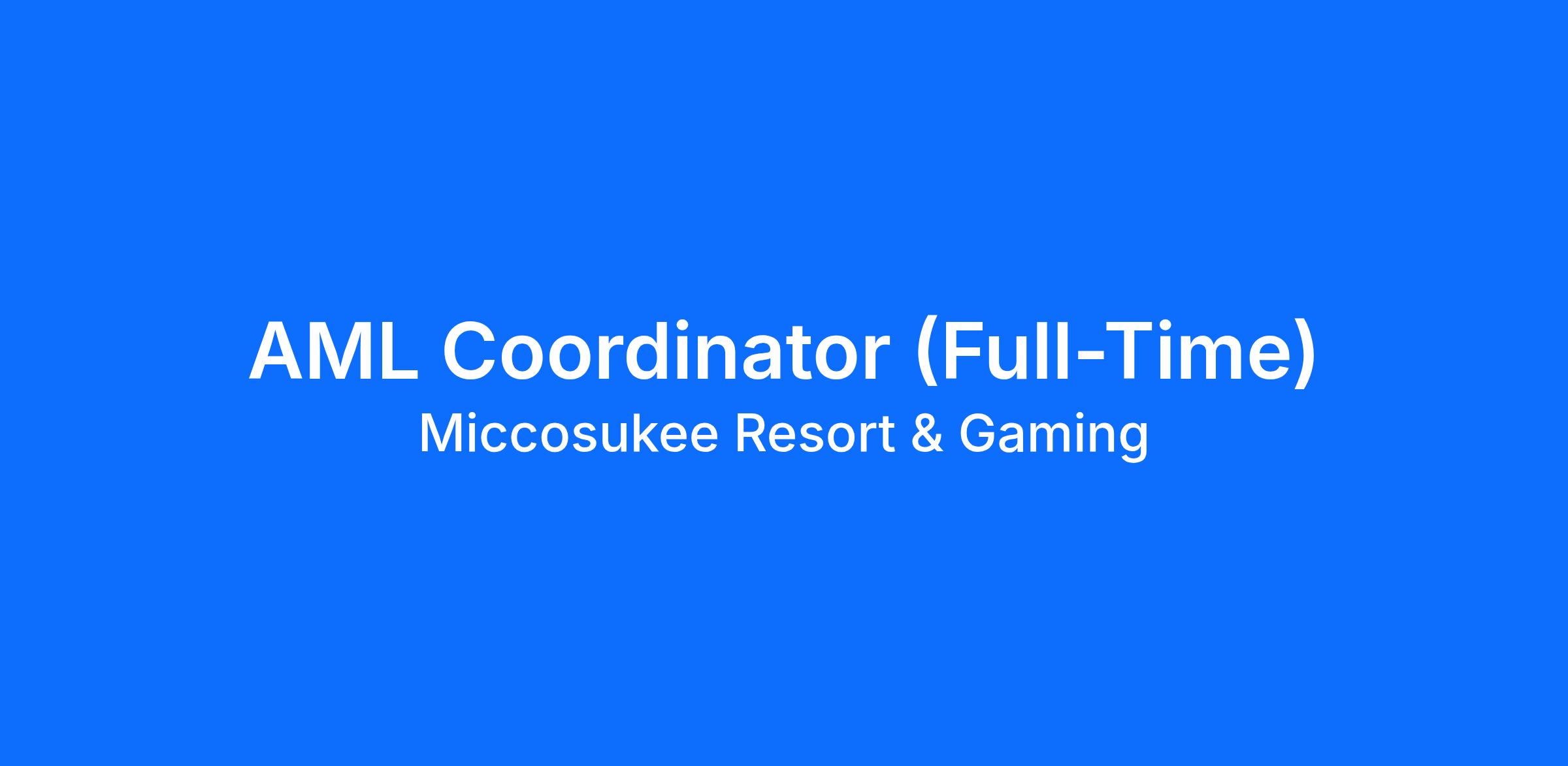 We are looking for an experienced AML Coordinator to join our team at Miccosukee Casino & Resort. As a valued team member, we are committed to delivering a memorable, impressive, caring, committed and original experience for our guests, our team members, and community. We uphold this commitment by providing a safe and enjoyable workplace where YOU are our number one priority. It is the MICCO way.