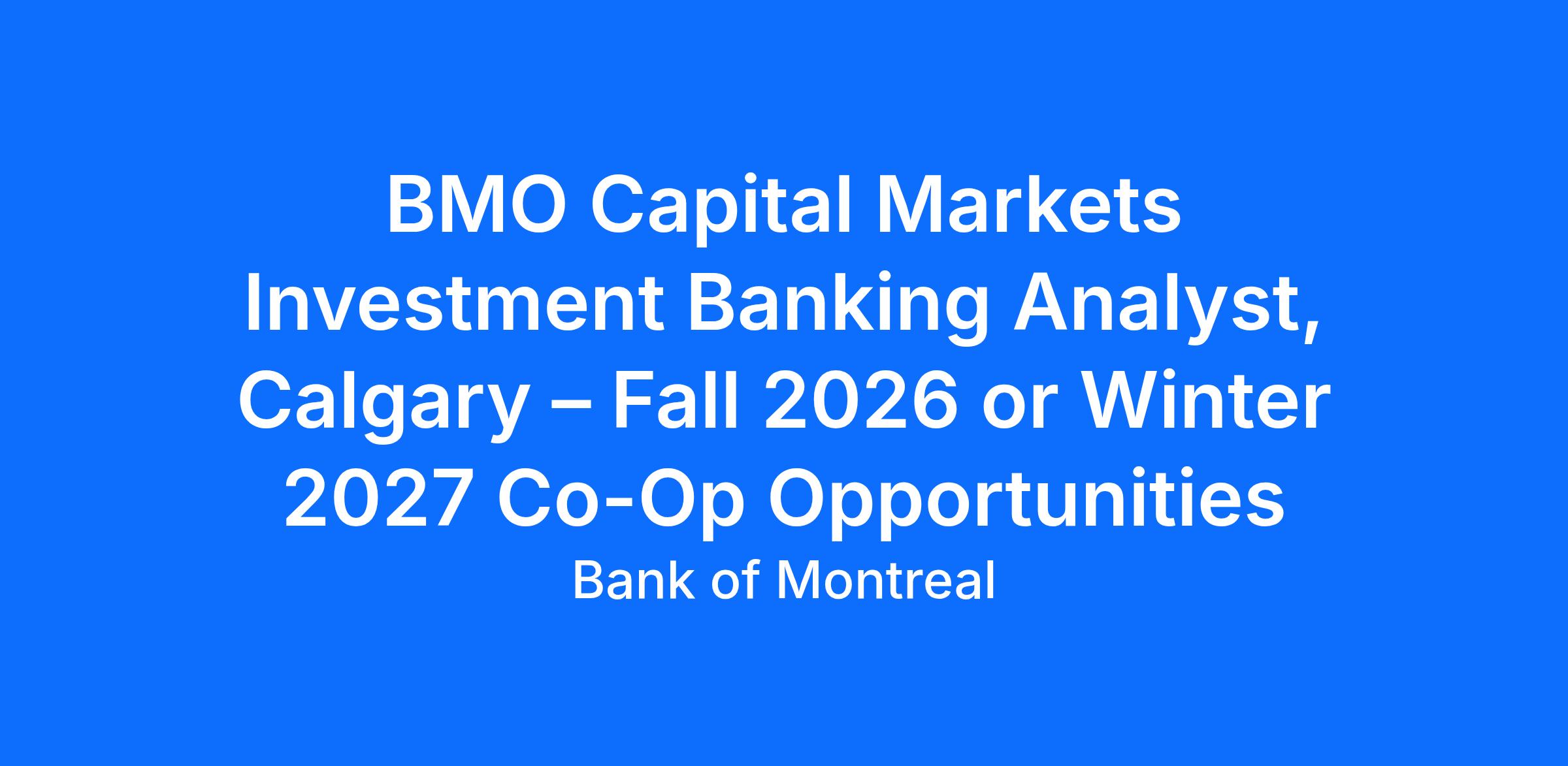 The BMO Capital Markets Investment Banking Calgary energy group provides a full suite of products and services to clients in the oil & gas production, power and energy infrastructure, and energy services sectors through an integrated Capital Markets platform, including M&A advisory and capital raising services. An Investment Banking Analyst Co-op is responsible for assisting teams in the development of pitch materials for current or prospective clients, and the ultimate execution of transactions. Primary responsibilities include: