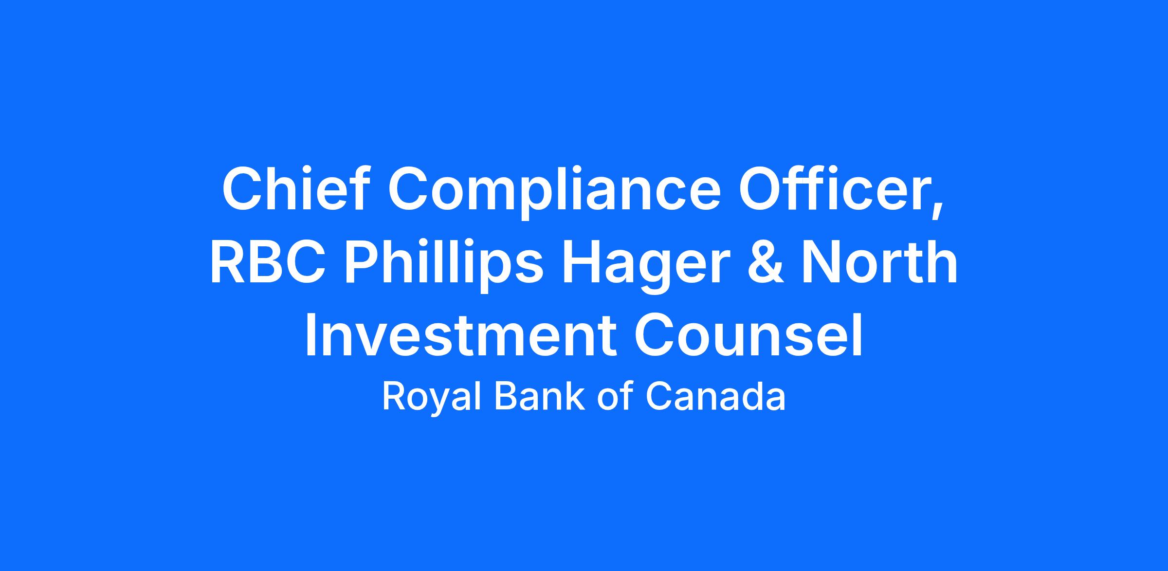 The Chief Compliance Officer, RBC Phillips Hager & North Investment Counsel & Director, RBC Wealth Management Canada Compliance, will lead a team responsible for compliance and regulatory oversight for the following businesses within RBC Wealth Management Canada: RBC Phillips Hager &North Investment Counsel Inc. (RBC PH&N IC), Royal Trust Company (RT) and RBC Private Counsel (USA) Inc. (RBC PC (USA)). The CCOs of RT and RBC PC (USA) report into this role.