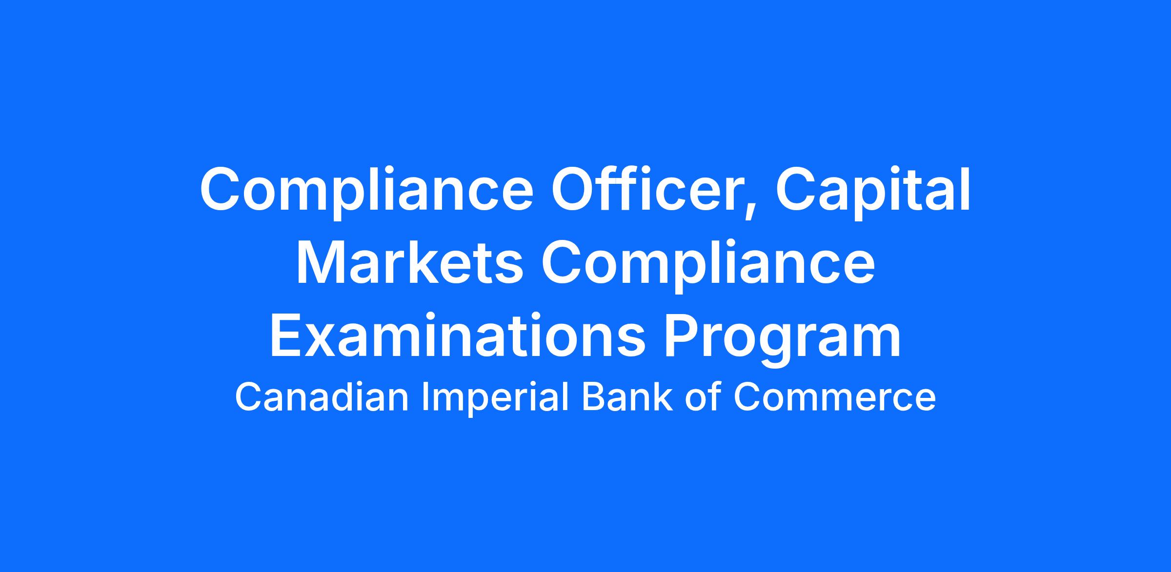 Compliance & Global Regulatory Affairs (Compliance & GRA) assists our Bank in developing and executing a robust and proactive regulatory compliance and regulatory affairs strategy, and effectively managing regulatory risk. The Compliance and EAML Examinations Program (CEEP) team, is a Centre of Excellence within the Compliance Department, and consists of several multi-skilled examination teams, including the Capital Markets Compliance Examinations team. Each of the teams have responsibilities for monitoring, advising and reporting on adherence to regulatory and business requirements, CIBC corporate policies, best practices and acceptable standards of business ethics and conduct.