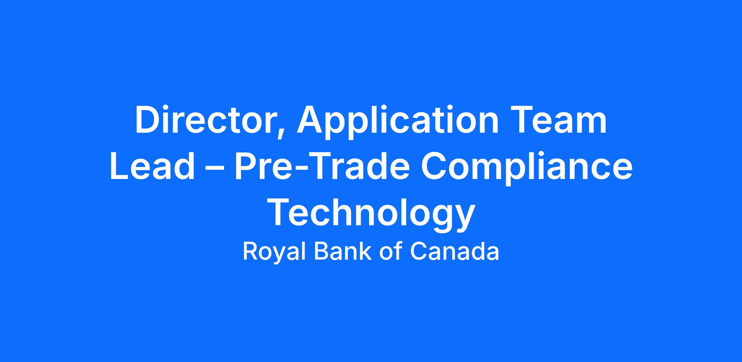 At RBC Capital Markets, we are seeking a talented leader to lead our Pre-Trade Compliance technology team. The team is responsible for "Fortress," an application that performs a broad set of pre-trade checks across a range of asset classes.
