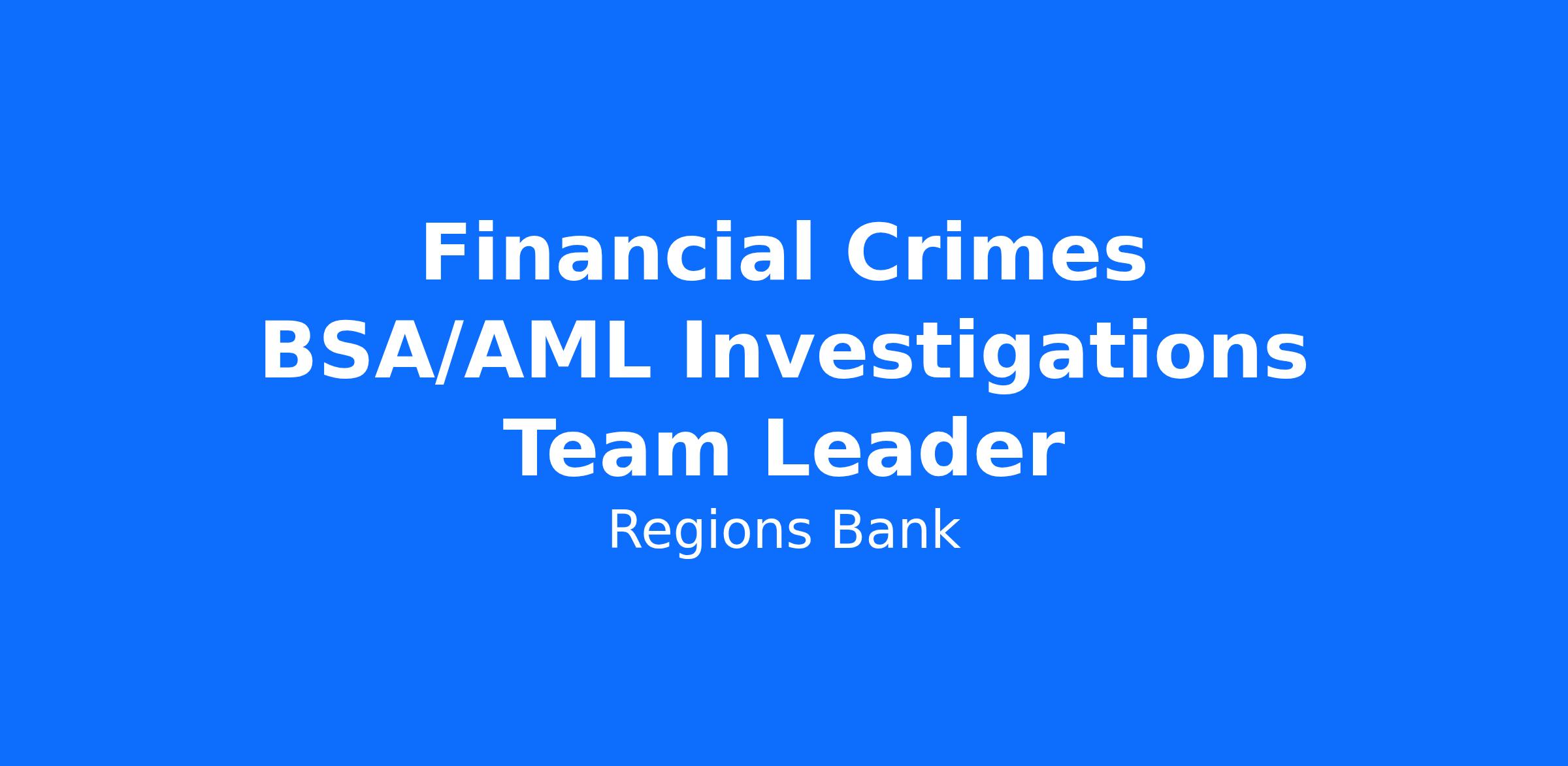 At Regions, the BSA/AML Investigations Team Leader is responsible for ensuring that the Bank conducts business in compliance with ethical business practices, company policies and legal requirements.