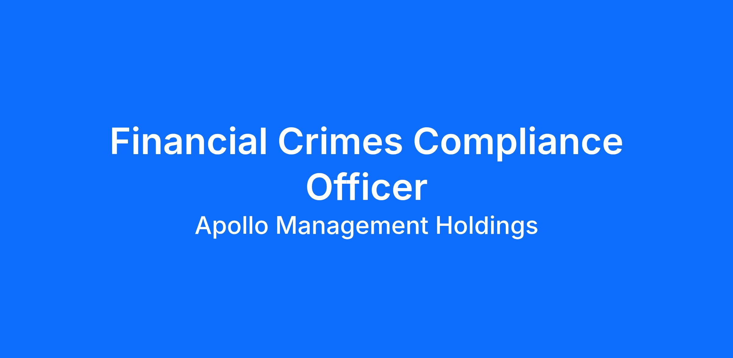 Apollo is seeking a Compliance Officer to join its Financial Crimes Compliance (FCC) team, whose mission is to prevent, detect, and address illicit financial activity across the firm. This individual will play a critical role in developing, implementing, and overseeing the firm’s global strategy to prevent, detect, and mitigate financial crime and reputational risks, including money laundering, terrorist financing, sanctions violations, fraud, bribery, and corruption risks, to ensure the Firm’s compliance with applicable international Anti-Money Laundering (AML), sanctions, and other financial crime regulations. The Compliance Officer will also help establish a compliance program for its digital assets business, including closely following regulatory developments and rulemaking in this space.