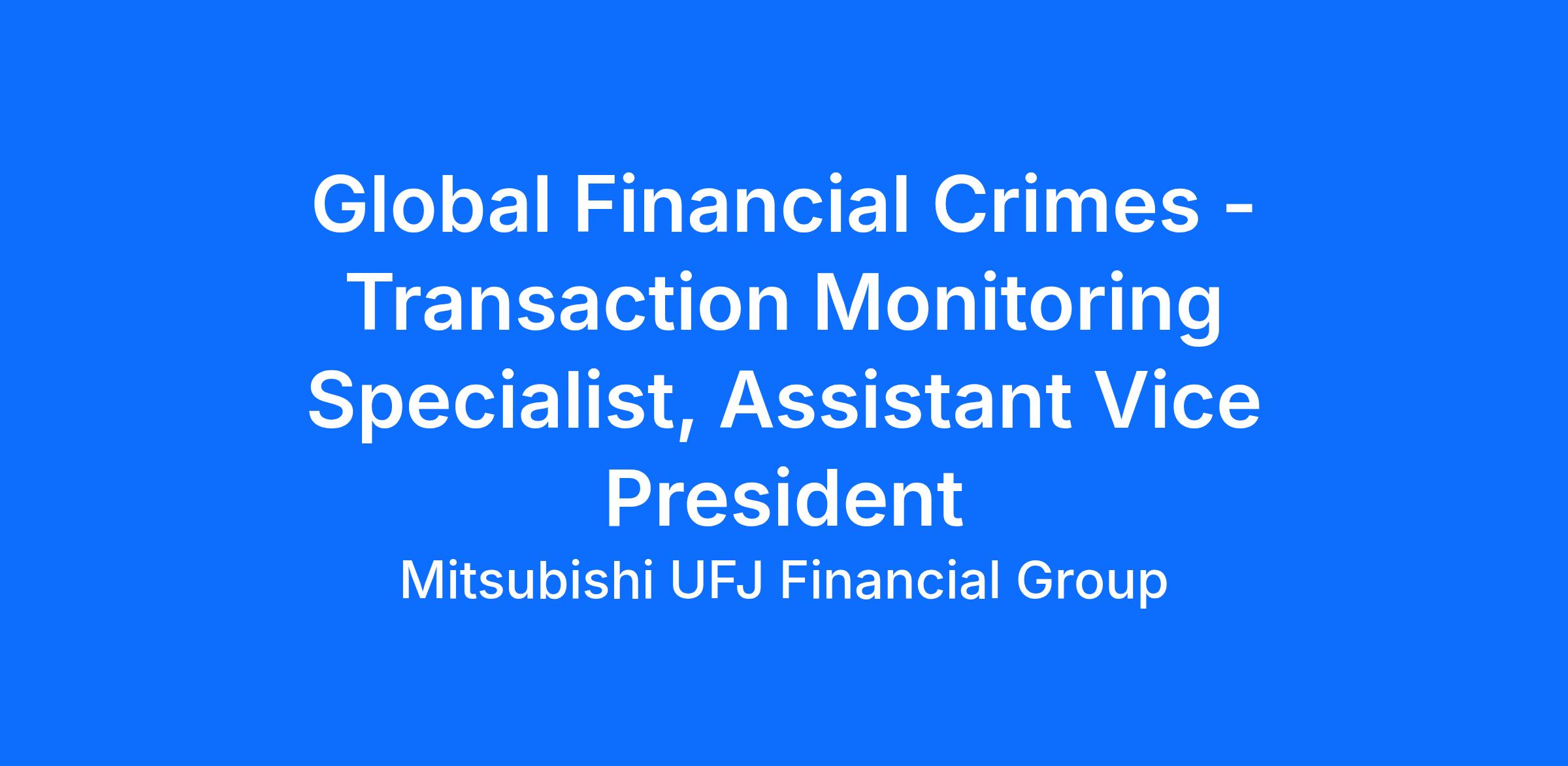 The selected colleague will work at an MUFG office or client sites four days per week and work remotely one day. A member of our recruitment team will provide more details.One of several key positions in the new Global Financial Crimes Division Operations function, this position will be responsible for (1) helping to identify detection scenarios, (2) provide analytics support for developing, tuning, optimizing and modifying segmentation to improve transaction monitoring and screening systems, and (3) helping to coordinate the implementation of scenarios, which detect financial crime. The incumbent is responsible for supporting leadership to ensure a globally consistent effort that enables continuing improvement to the transaction monitoring capabilities and further mitigate potential financial crime.