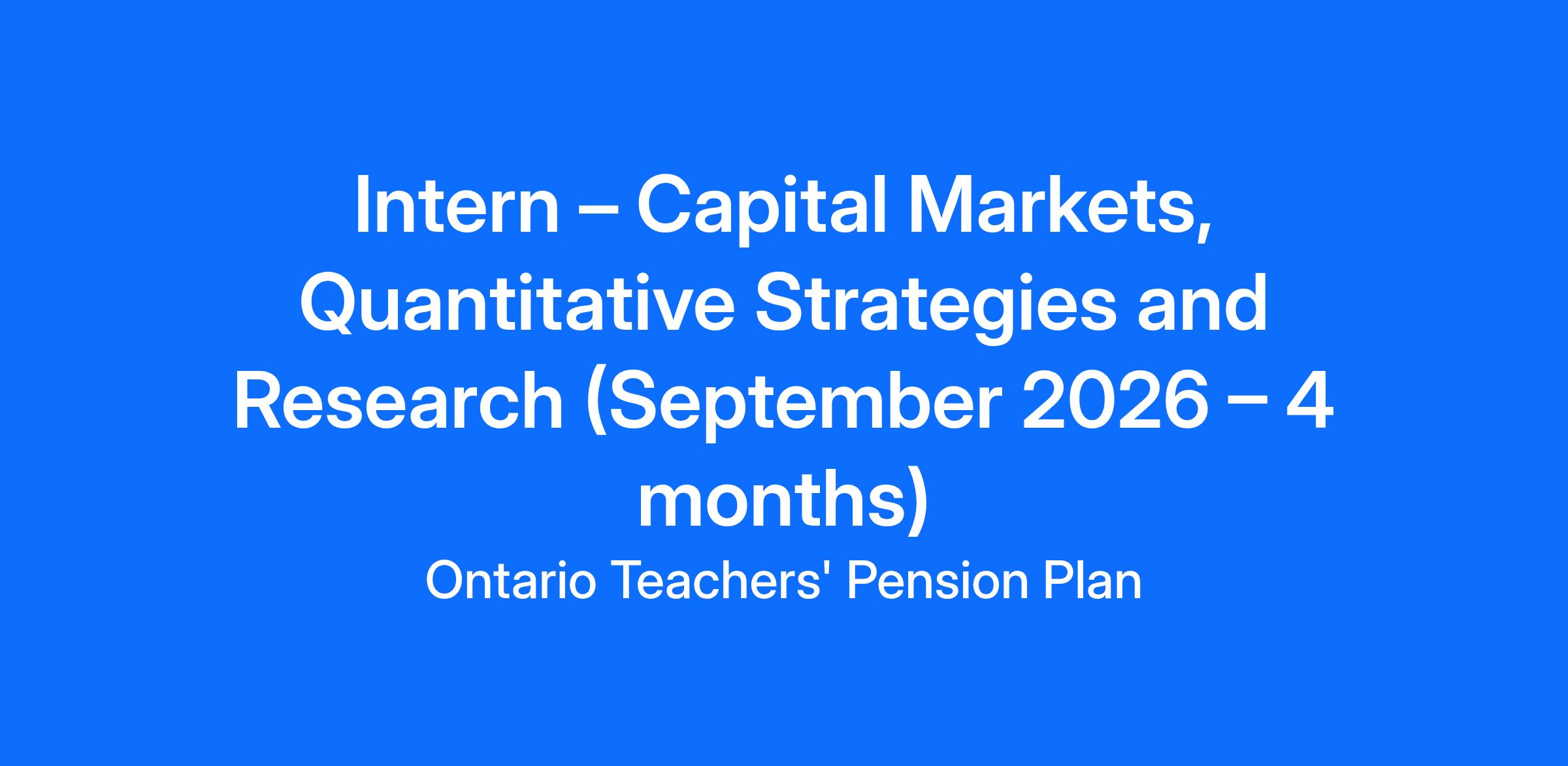 We are Quantitative Strategies and Research (QSR), an innovation-driven team within Capital Markets at Ontario Teachers’ Pension Plan. We manage a broad and diversified portfolio, built using quantitative models, and are looking for an intern to join us this Winter 2026.