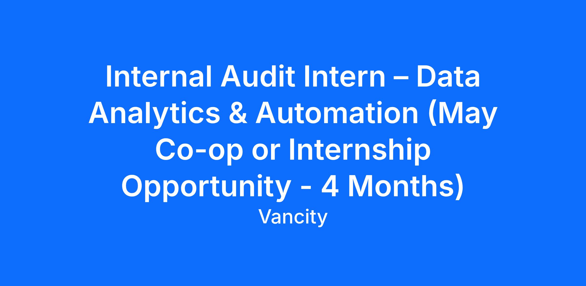 We’re looking for an intern to join our Internal Audit team for a 4-month opportunity. The Internal Audit team supports Vancity’s Board and Executive by providing independent assurance, advice, and insights over key risk areas. This role provides hands-on experience to internal audit practices and a unique opportunity to be part of Internal Audit’s exciting journey to accelerate automation that enables stronger oversight of key risks. This opportunity is best suited for candidates with a strong acumen in business and data analytics, and a keen interest in developing and implementing RPA/AI use cases.
