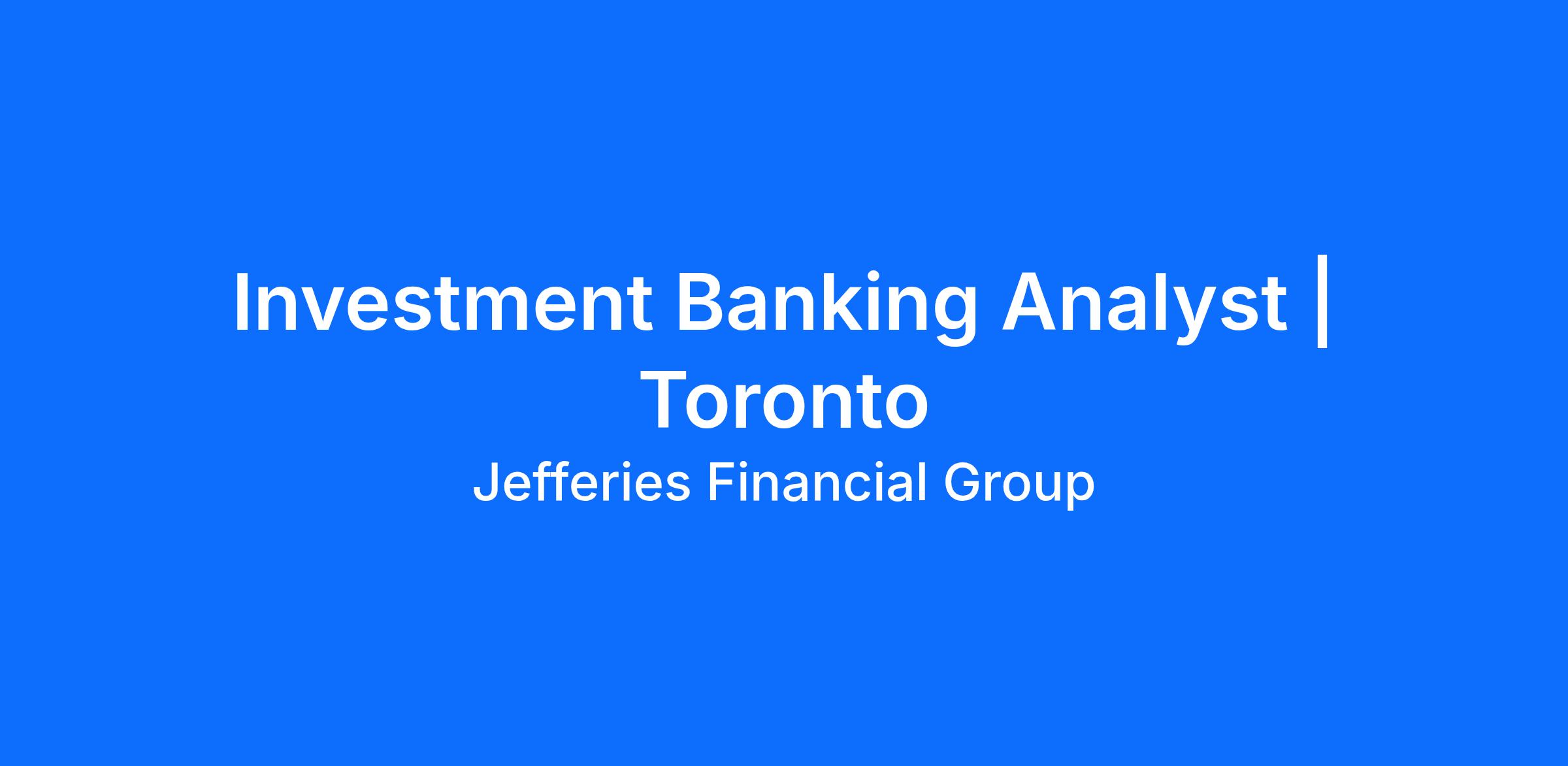 Jefferies is excited to have just opened up a new search for an Investment Banking Analyst to join our newly formed team in Toronto. New joiners will have the opportunity to partner with some of the region's top bankers in transactions across multiple industries and product types.