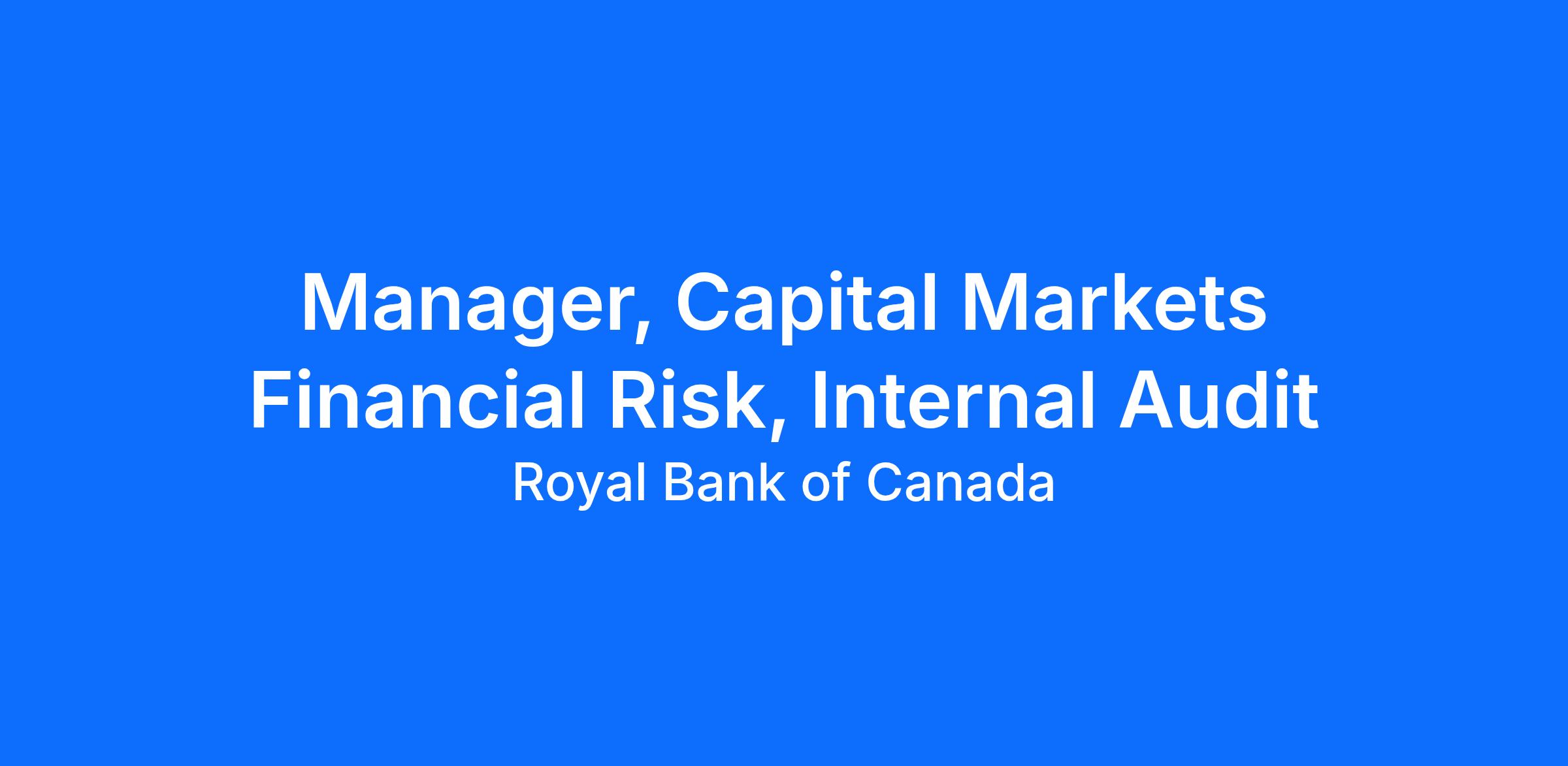This is an exciting opportunity to be a key member of the CAE/Internal Audit, Capital Markets Financial risk team. As a Manager, you will report to Director, and provide an independent and objective assessment of the effectiveness of RBC’s risk management practices with a primary focus on Market Risk and Counterparty Credit Risk across RBC entities globally. The role also requires supporting audit planning, reporting and validation of regulatory issues.