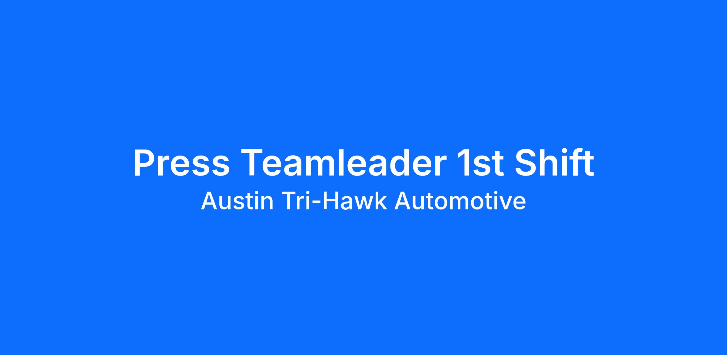 The Press Team Leader is responsible for leading a team of press associates to ensure safe, efficient, and high-quality production by supervising daily stamping operations, coordinating workflow, and supporting team development. The Team Leader also will assist the Press Coordinator in administration area by being responsible for directed tasks and or short-term goals for the press area. Lead and direct Press team by modeling professionalism and specific procedures for safe manufacturing of high quality automotive structural parts.