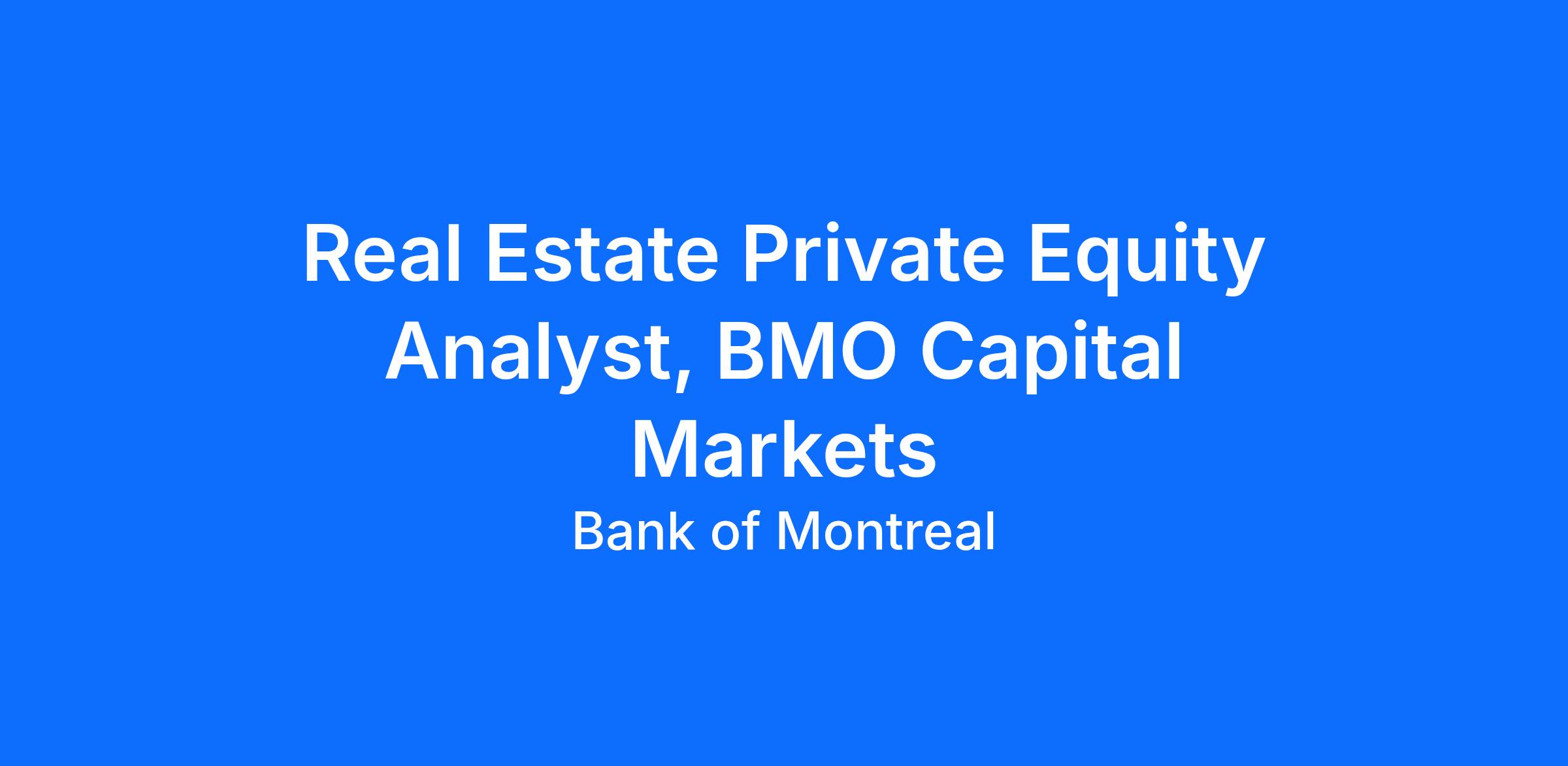 BMO Capital Markets is seeking an Analyst to join the BMO Real Estate Fund (“BRE Fund”) team in Toronto. BRE Fund invests the Bank of Montreal’s balance sheet alongside well respected real estate asset managers/developers as direct equity in development and value-add projects across Canada.