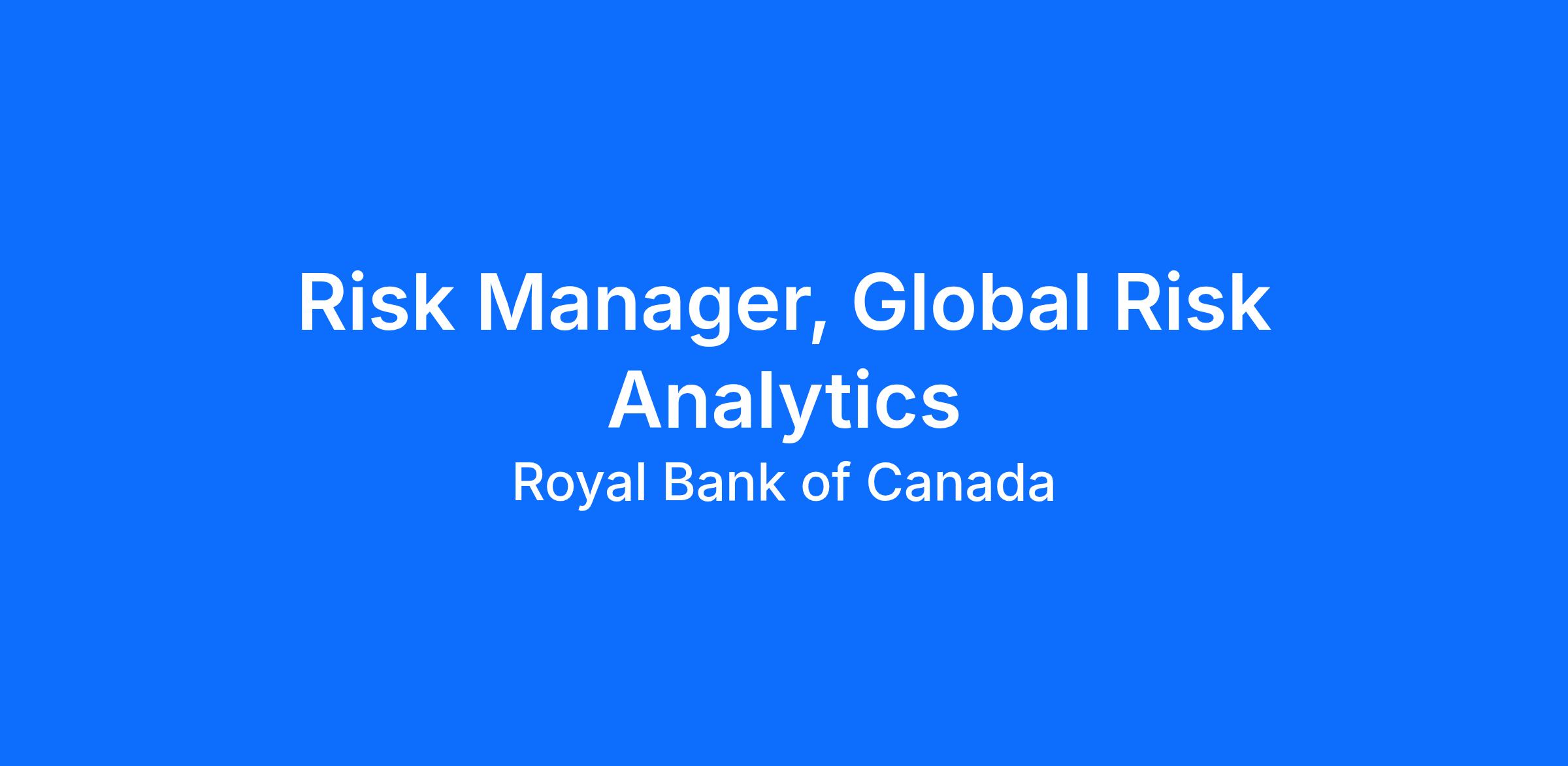 As part of the Group Risk Management team, the Risk Manager, Global Risk Analytics is responsible for the conceptual design, development, and ongoing maintenance of the mathematical models used for the measurement and capitalization of the market risk and CCR of RBC's trading portfolio.