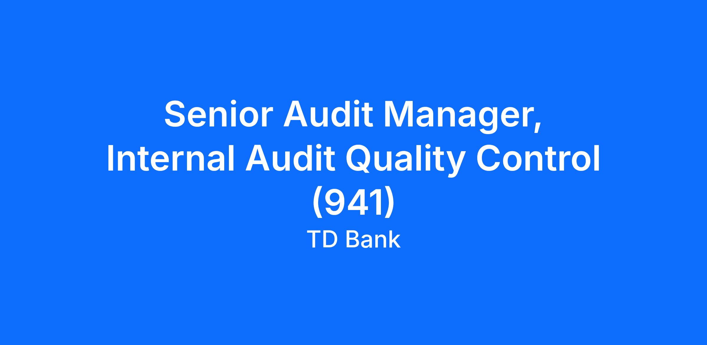 The Audit Division Quality Control professionals are responsible for the execution of Quality Control reviews to assess Internal Audit's compliance with established standards and procedures. The Senior Manager, Quality Control, reporting to the Vice President, Internal audit will execute Quality Control reviews and act as a subject matter expert in own area of expertise. Portfolio for this opportunity is Canadian Business Banking and Credit Risk.
