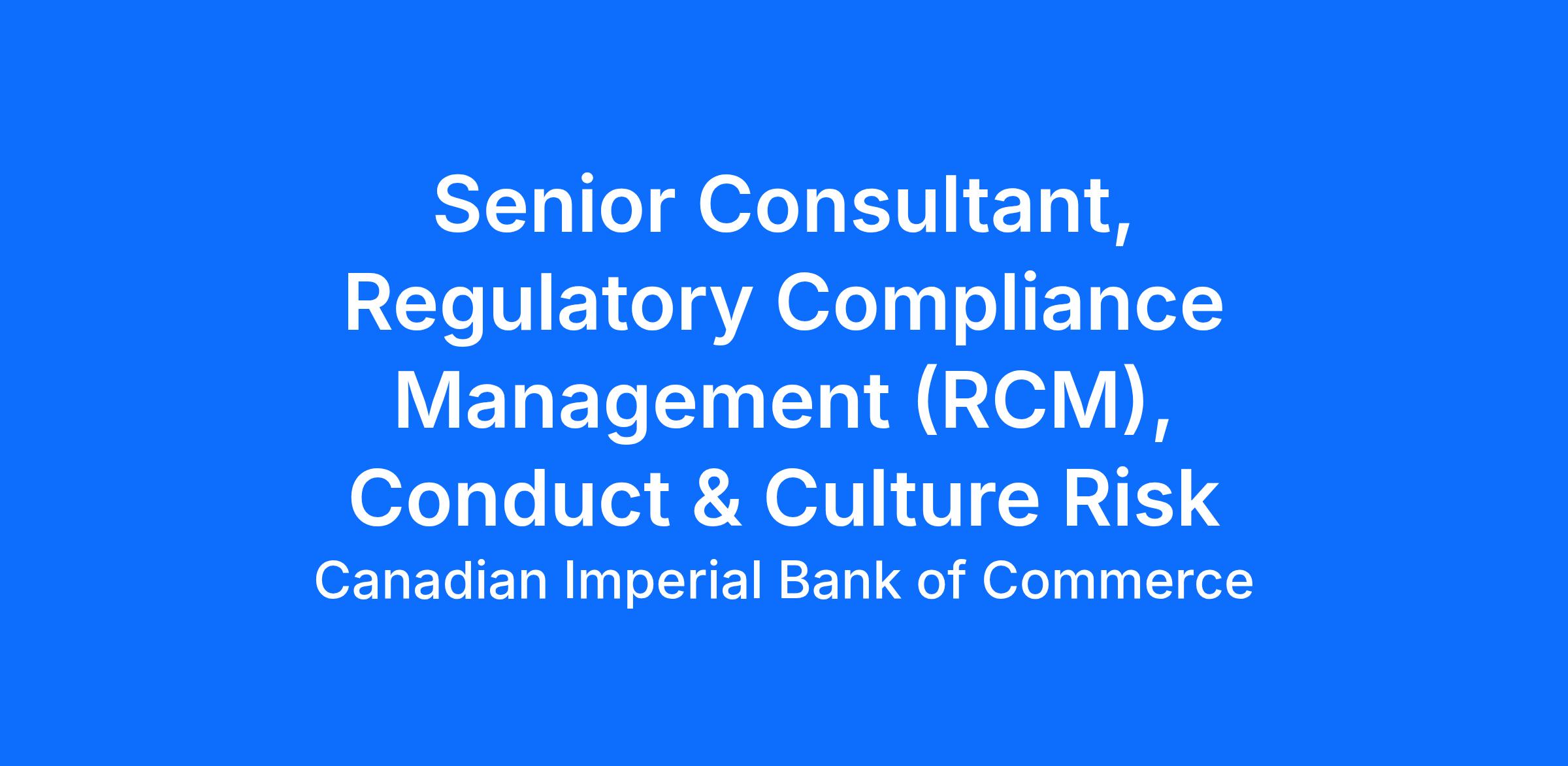 The Senior Consultant, Regulatory Compliance Management (RCM), Conduct & Culture Risk is a key member of the Conduct & Culture Risk team, serving as the Primary Oversight Function (OF) Lead and reporting to the Director, Conduct & Culture Risk. You will supports the RCM Accountable Officer and will be responsible for executing oversight activities while serving as a subject matter expert for specific regulatory requirements related to conduct risk, culture risk, compensation risk, and bribery and corruption risk, ensuring the Bank’s regulatory compliance risk is managed within acceptable levels and in accordance with CIBC’s RCM Policy and supporting documentation.