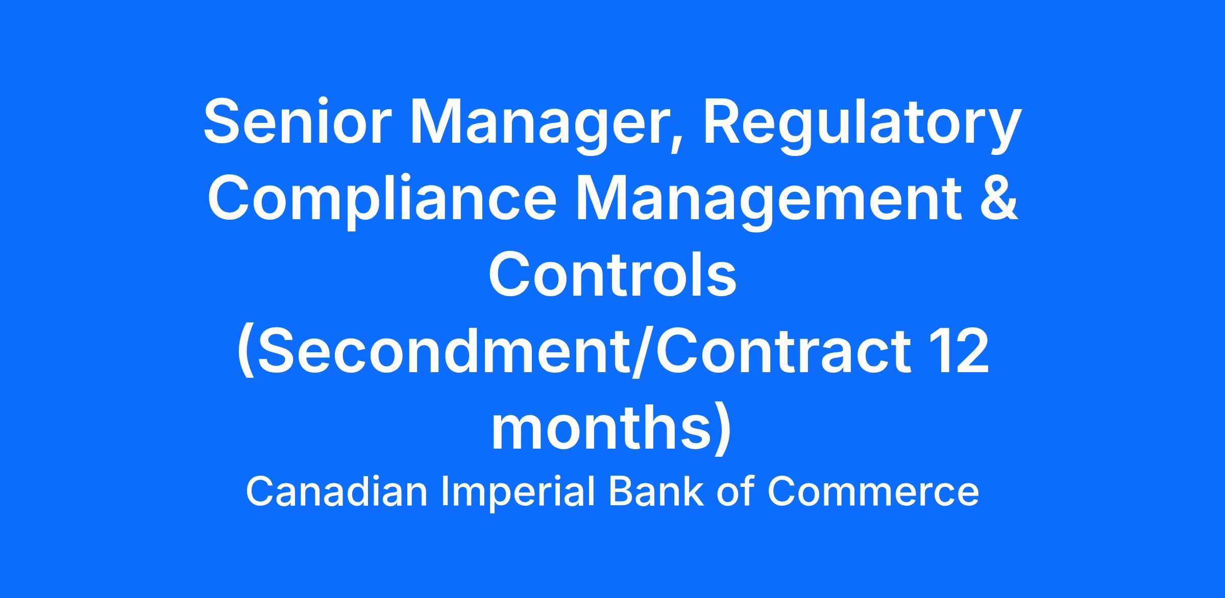 Risk Management is led by the SEVP and Chief Risk Officer (CRO) and is accountable on matters relating to the independent oversight of the management of risks inherent to the activities of CIBC, its subsidiaries and affiliates. These risks include but are not limited to ensuring that effective processes are in place for the identification, management, measurement, monitoring and control of operational, reputation and legal, market, credit, strategic, investment and liquidity risk, collectively “CIBC Risk”, incurred by CIBC’s retail and wholesale businesses, infrastructure and corporate governance groups. The Senior Manager will be reporting to the Director, Governance and Controls in the Risk Management Governance & Business Effectiveness Team. Your primary responsibility will be acting as the Regulatory Compliance Management (RCM) contact within the Governance and Controls/1B team and supporting/advising various Risk LOBs on RCM and controls activities such as RCM Effectiveness Assessment, Independent Monitoring, RCM Control Environment Reporting support, Monthly Regulatory Development process, and Compliance Examination support related to controls.