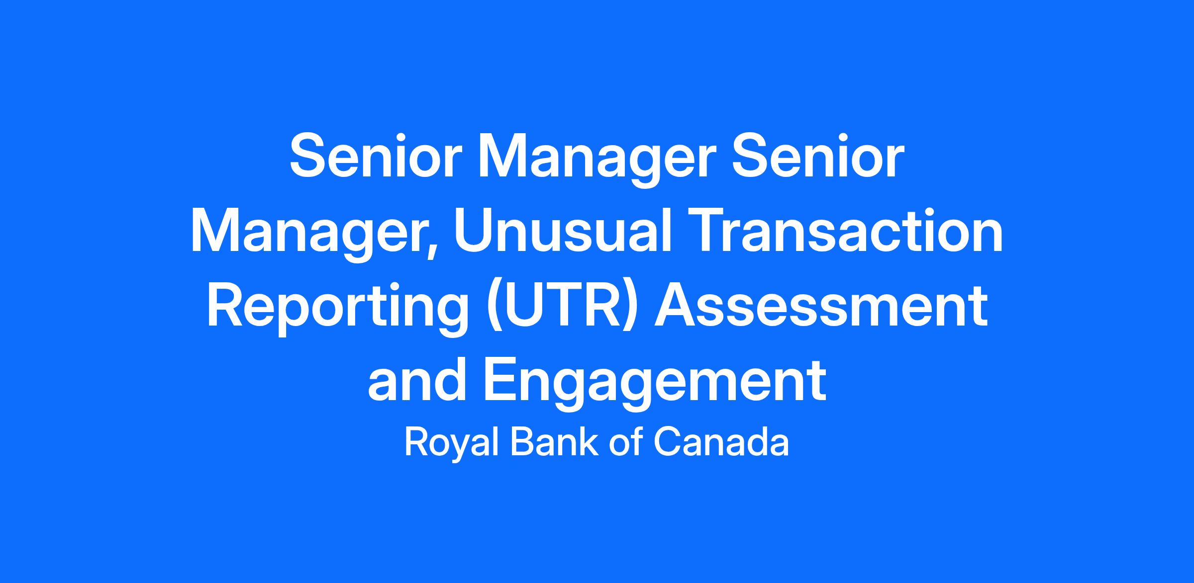 The Senior Manager, Unusual Transaction Reporting (UTR) Assessment and Engagement supports the Director in advancing UTR-related activities across the enterprise. Unusual Transaction Reports (UTRs) are a key element of RBC Anti-Money Laundering (AML) Program, helping identify activity that may present elevated risk and supporting compliance with regulatory expectations. Working within the Financial Crimes group, the Senior Manager role contributes to the refinement and maintenance of UTR expectations, indicators, reference materials, and reporting inputs to ensure they remain clear, current, and aligned to operational and regulatory requirements.