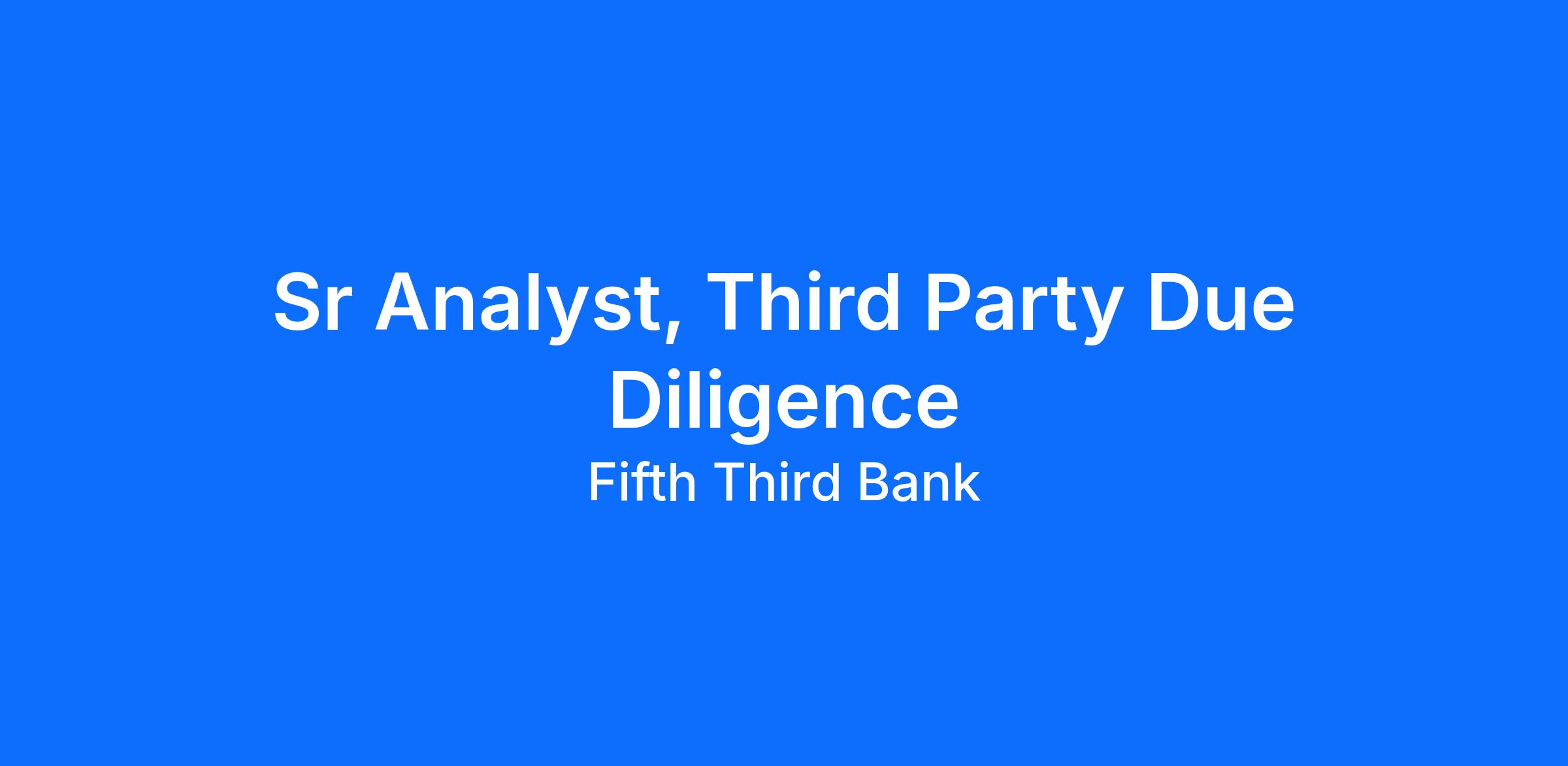 Sr Analyst, Third Party Due DiligenceAt Fifth Third, we understand the importance of recognizing our employees for the role they play in improving the lives of our customers, communities and each other. Our Total Rewards include comprehensive benefits and differentiated compensation offerings to give each employee the opportunity to be their best every day.