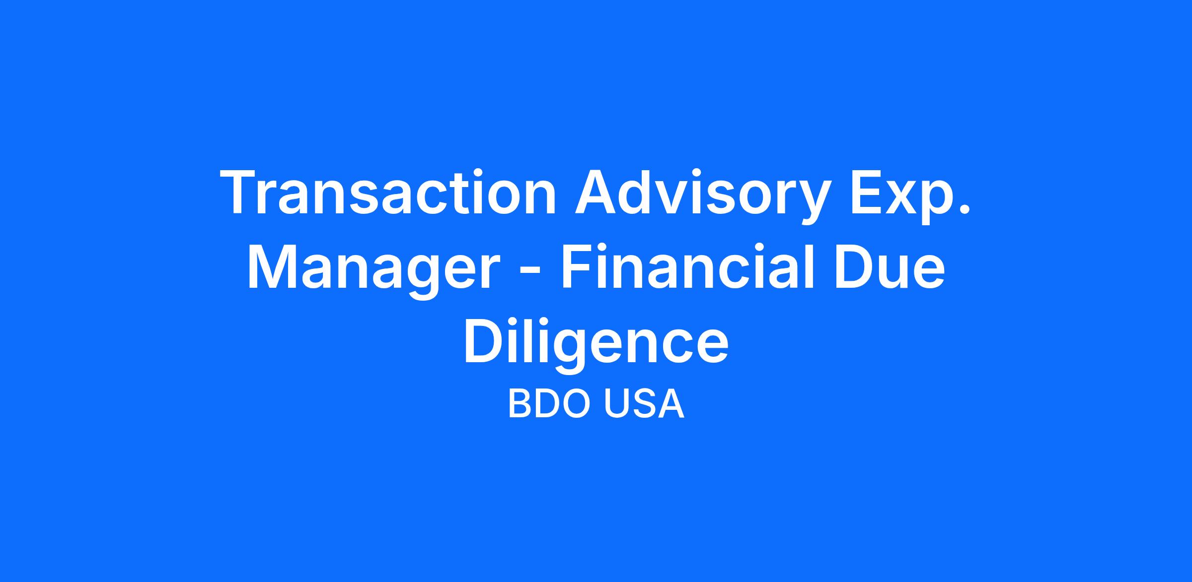 The Transaction Advisory Services Experienced Manager will be responsible for managing financial, accounting and operational due diligence engagements for both strategic and financial buyers throughout the United States.