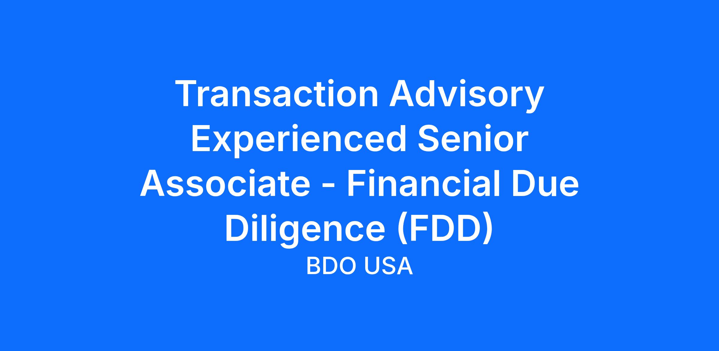 The Transaction Experienced Advisory Services Senior Associate will be responsible for managing financial, accounting and operational due diligence engagements for both strategic and financial buyers throughout the USA.