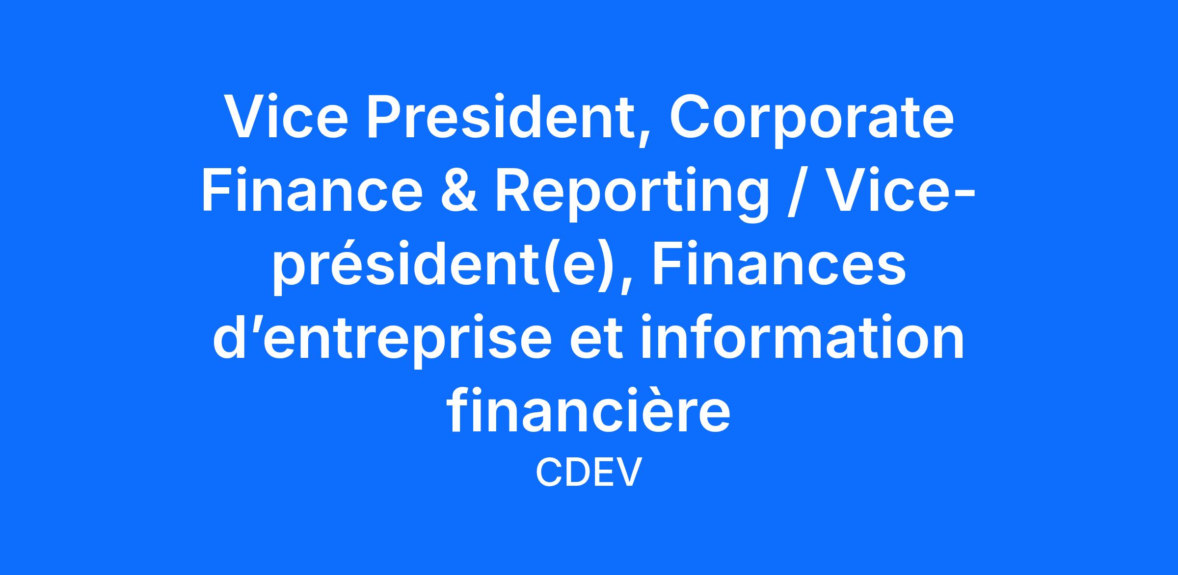 Le (la) vice-président(e), Finances d’entreprise et information financière, est un(e) cadre supérieur(e) qui dirige et supervise l’ensemble des rapports financiers, des opérations comptables et des fonctions de contrôle de la Corporation de développement des investissements du Canada (CDEV) et de ses filiales.